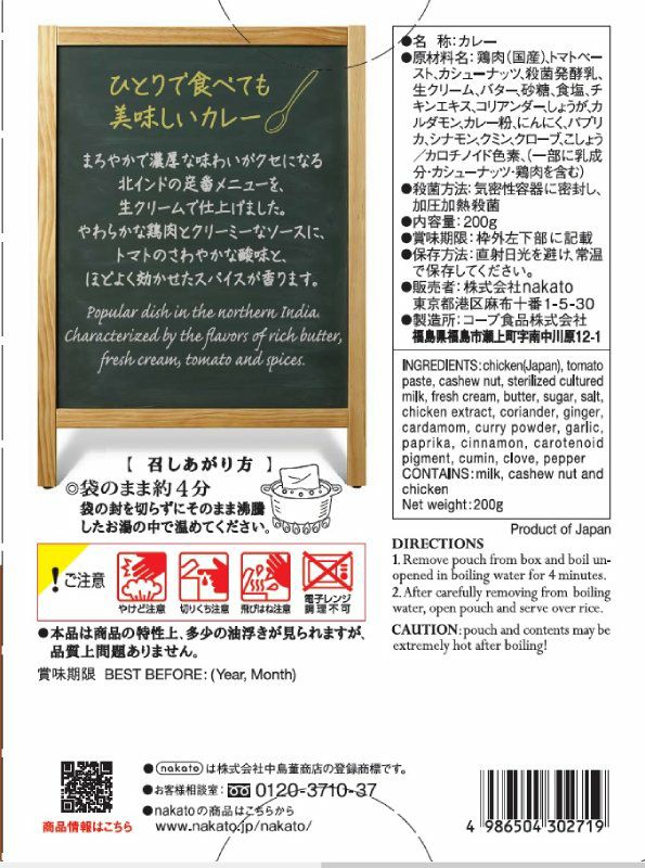 - 鶏肉(国産)、トマトペースト、カシューナッツ、殺菌発酵乳、生クリーム、バター、砂糖、食塩、チキンエキス、コリアンダー、しょうが、カルダモン、カレー粉、にんにく、パプリカ、シナモン、クミン、クローブ、こしょう/カロチノイド色素、(一部に乳成分・カシューナッツ・鶏肉を含む)