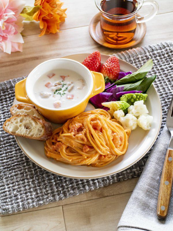 - かに、トマト、クリームの味のバランスにこだわりました。生クリームを使ったコクのある深い味わいに、白ワインを加えてすっきりと上品な味わいに仕上げました。