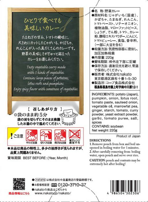 - じゃがいも(国産)、かぼちゃ、たまねぎ、れんこん、トマトペースト、ソテーオニオン、植物油脂、マローファットピース、しょうが、でん粉、トマト、カレー粉、酵母エキスパウダー、にんにく、トマトピューレー、食塩、香辛料、(一部に大豆を含む)