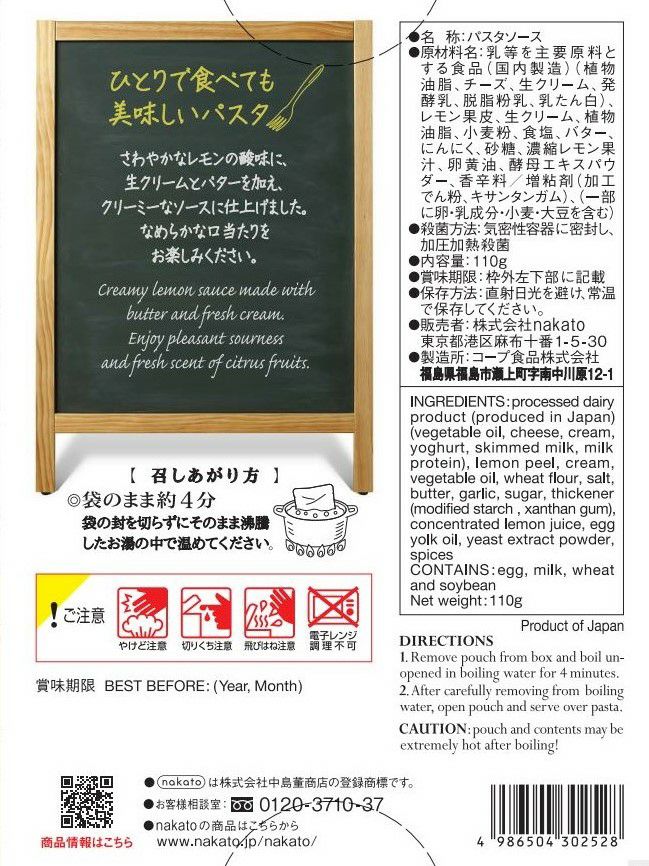 - 乳等を主要原料とする食品(国内製造)(植物油脂、チーズ、生クリーム、発酵乳、脱脂粉乳、乳たん白)、レモン果皮、生クリーム、植物油脂、小麦粉、食塩、バター、にんにく、砂糖、濃縮レモン果汁、卵黄油、酵母エキスパウダー、香辛料/増粘剤(加工でん粉、キサンタンガム)、(一部に卵・乳成分・小麦・大豆を含む)
