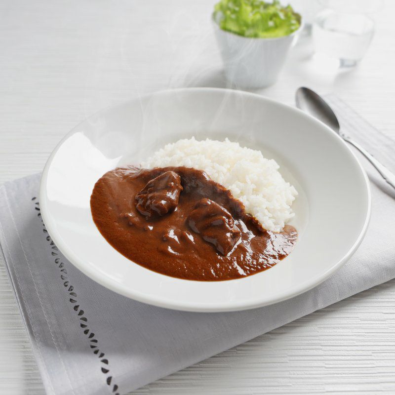 - カレールウ(国内製造)(小麦粉、カレー粉、砂糖、植物油脂、ラード、食塩、オニオンパウダー、トマトペースト、オニオンエキス、チーズ、でん粉、ココナッツミルクパウダー、乳糖、ポークエキス、酵母エキス、ウコン)、牛肉、ソテーオニオン、トマトペースト、カカオマス、バター、チャツネ、クミン、コリアンダー、しょうが、にんにく、砂糖、カルダモン、クローブ、こしょう、シナモン/調味料(アミノ酸等)、カラメル色素、増粘剤(グァーガム)、酸味料、(一部に乳成分・小麦・牛肉・大豆・豚肉・りんごを含む)
