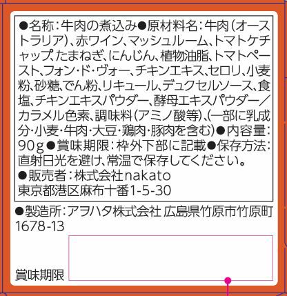 - 牛肉(オーストラリア)、赤ワイン、マッシュルーム、トマトケチャップ、たまねぎ、にんじん、植物油脂、トマトペースト、フォン・ド・ヴォー、チキンエキス、セロリ、小麦粉、砂糖、でん粉、リキュール、デュクセルソース、食塩、チキンエキスパウダー、酵母エキスパウダー/カラメル色素、調味料(アミノ酸等)
