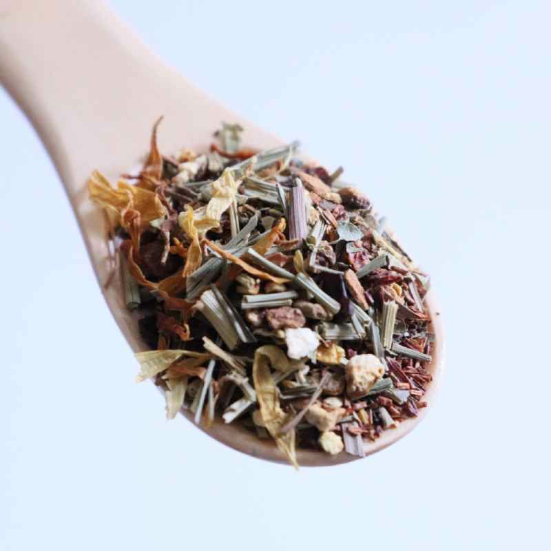 - ルイボス、オレンジ果皮、シナモン、ローズヒップ、レモングラス、レモンバーベナ、カンゾウ根、クローブ、マリーゴールド/香料、(一部にオレンジを含む)
