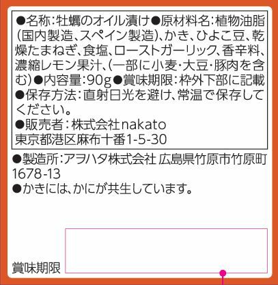 - 植物油脂(国内製造、スペイン製造)、かき、ひよこ豆、乾燥たまねぎ、食塩、ローストガーリック、香辛料、濃縮レモン果汁、(一部に小麦・大豆・豚肉を含む)