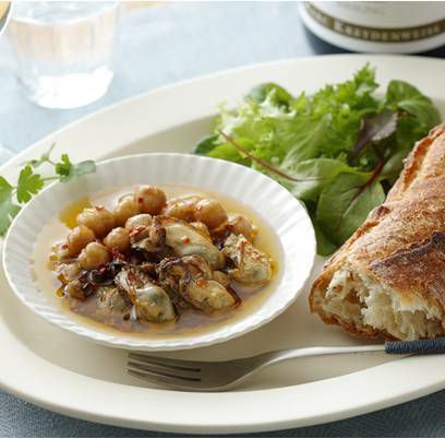 - ガーリックとほんの少し辛味を効かせたオイルが、牡蠣とひよこ豆の美味しさを一層引き立てています。