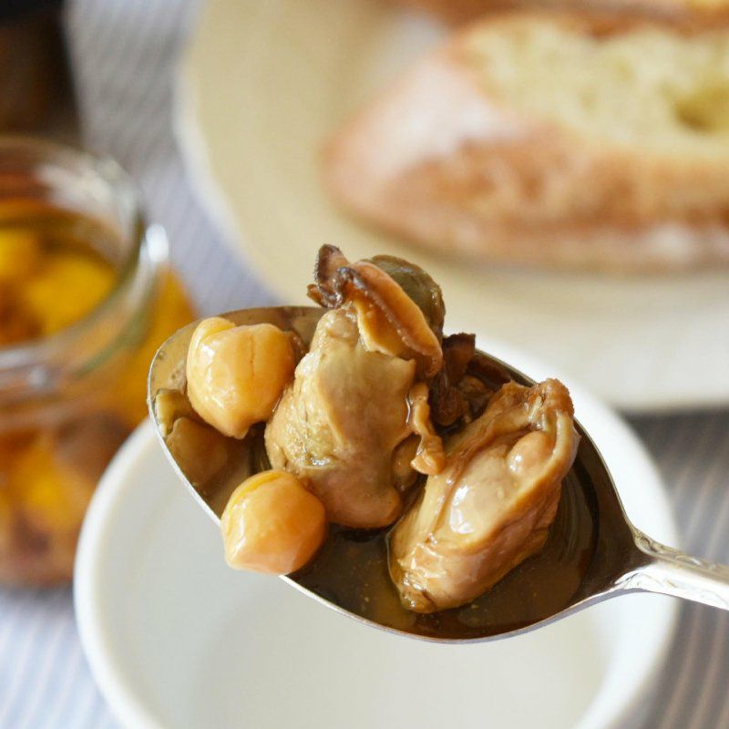 広島県産の牡蠣と、ほくほくした食感のひよこ豆をにんにくを効かせたオイルに漬けました。