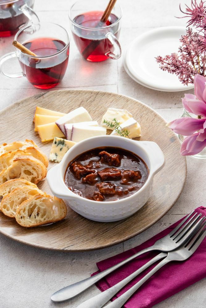 - ソテーした牛ほほ肉の旨みのつまったスープに、ソテーした香味野菜とデュクセルソースを加えて作ったこだわりのドミグラスソースの深い味わいに、赤ワインの華やかな香りが広がります。